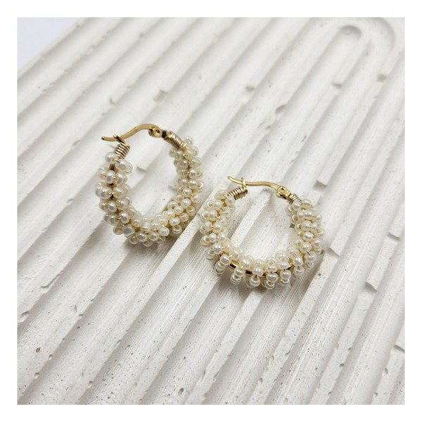 Argollas de acero dorado, cosidas con mostacillas de vidrio.